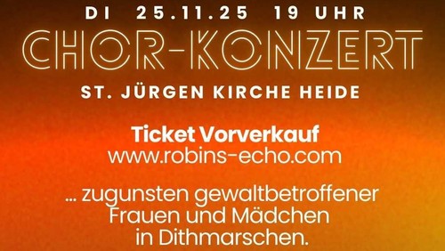 Chor-Konzert von Robin8s Echo Der Charity-Chor gibt einen Einblick in sein Programm 2025 und präsentiert eine musikalische Reise durch ein ganzes Jahrhundert. Der Erlös aus dem Kartenverkauf und alle weiteren Spenden kommen dem „Hilfsfonds für gewaltbetroffene Frauen und Mädchen in Dithmarschen“ zugute, siehe Rückseite. Dienstag, 25.11.2025, 19.00 Uhr: St. Jürgen Kirche, Am Markt, Heide Vorverkauf: www.robins-echo.com.